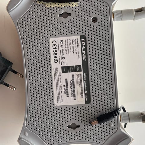 TP-Link Trådløs Router med eksterne antenner og strømforsyning. Enheden har flere kabler til tilslutning og er designet til trådløs internetforbindelse.4g