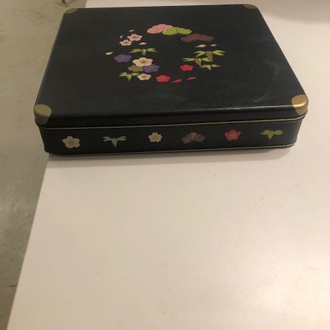 Smuk, gammel, forholdsvis stor metaldåse. Japanske - orientalske motiver. Måler 19x12x12 cm. Der er misvisende misfarvning på de fotos! Der er ingen fejl på motiverne.