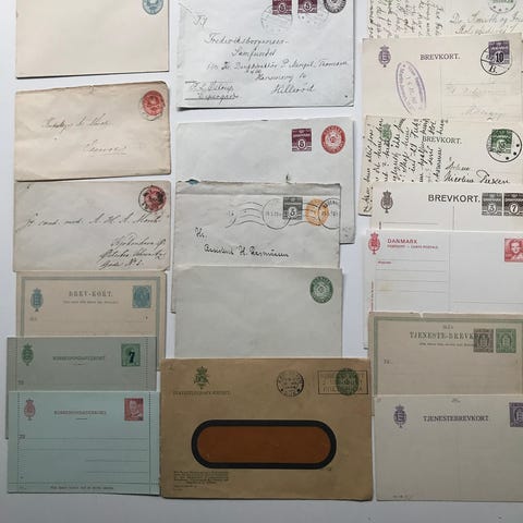 134 brevkort med fortrykte frimærker, både ældre og nyere, stemplede og ustemplede og med forskellige løbenumre, flere opfrankerede og overtrykte med ny værdigengivelse. 3 korrespondancekort, 1 tjenestebrevkort, 3 korsbånd og 10 kuverter (alle med fortrykte frimærker) og en udfoldet brevduering sendt under Hafnia 76-udstillingen (se sidste billede).