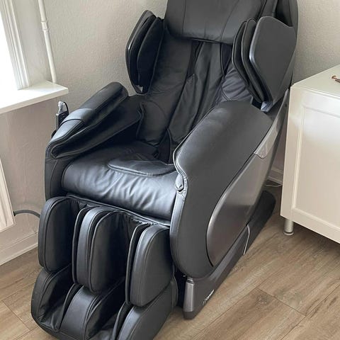 Massagestol med Fodskammel og Fjernbetjening. Stolen er lavet af sort læder med trædetaljer og inkluderer en tilhørende fodskammel. Den har indbygget massagefunktion med flere funktioner, som styres via en medfølgende fjernbetjening, Den virker rigtig godt fejler ingenting, kan ikke leveres eller sendes skal hentes i Kolding. Er fra et ikke ryger hjem og ingen husdyr