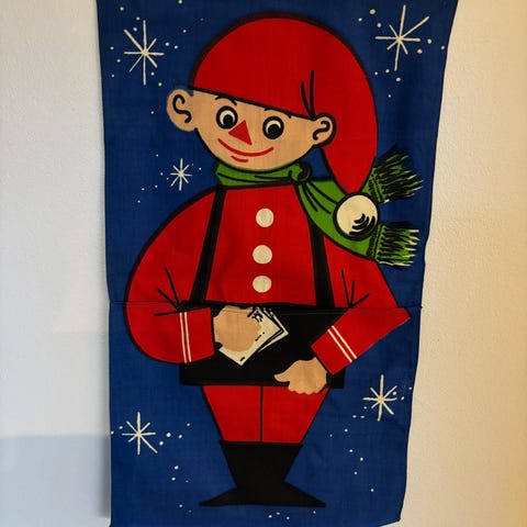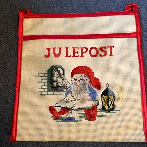 Juledekoration til postbrev og kort, lavet i stof med motiver af en nisse i rød og grøn på en blå baggrund. Velegnet til juledekoration. Materiale og størrelse er ikke specificeret.