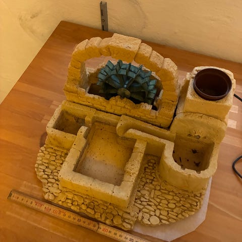 Dekorativ håndlavet vindmølle model fremstillet i træ og metal. Møllen har en hvid og grå farve med røde og blå detaljer på vingerne. Den har flere små vinduer og en dør, samt en sort rækværksindhegning omkring midten. Velegnet som dekorativ genstand til hjem eller have. Højde 113cm og bund er 38.5 cm x 4 den trænger til en kærlig hånd, men det er et renoveringsprojekt som jeg må erkende at jeg ikke får tid til. 2000kr eller giv et bud
