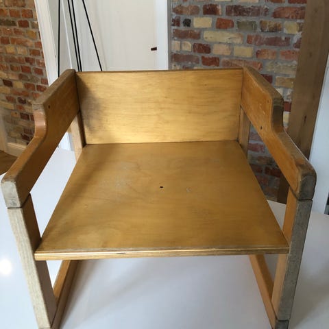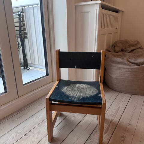 Sælger en lille retro træstol. Den har tydelige brugsspor og trænger til slibning/olie, men er stabil og står fint.