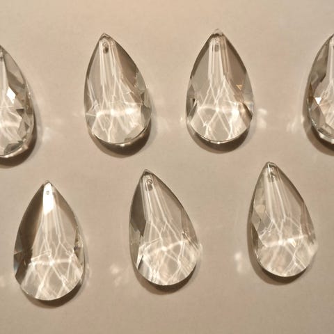 Så er der en lang gammel ægte krystal prisme kæde med divergerende størrelser. Meget smukke. Og mindst 120 år gamle. Hele kæden sælges for 175,-. De største prismer på kæden er næsten umulige at skaffe idag.