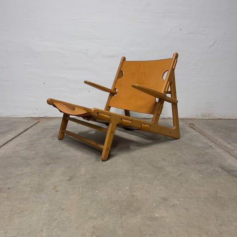 Jagtstolen, der er designet af Børge Mogensen i 1950, er fremstillet i massiv egetræ og kernelæder.