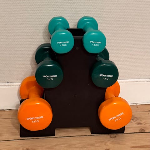 Par af håndvægte på 1 kg hver, belagt med rosa neopren materiale. Velegnet til let træning og genoptræning.