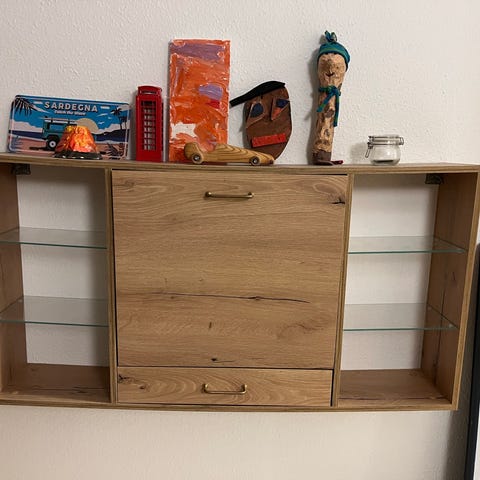 Design: Bordet har et minimalistisk og kompakt design med to praktiske hylder og en perforeret tavle, der giver ekstra funktionalitet og opbevaringsmuligheder. Det er nemt at montere og skabt til at kombinere æstetik med effektivitet.