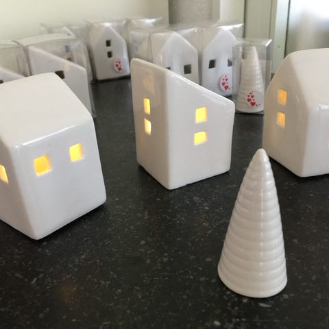 IKEA Keramik Dekorationshuse Sæt bestående af 3 stk i sort og hvid farve. Materialet er keramik, og husene har forskellige designs med vinduer og døre. Velegnet som dekoration til indendørs brug, især i julen. Prisen er for alle tre huse.