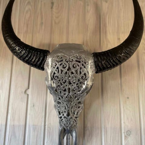 Dekorativ kranie med detaljerede udskæringer og horn. Kraniestørrelse er cirka som vist i forhold til spillekort for skala. Kan anvendes som vægdekoration eller til kunstprojekter.