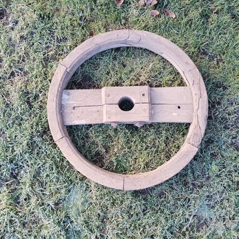 Smukt Antik træhjul/tovtræk sælges. Meget dekorativt og til ophæng på væg som dørkrans eller som adventskrans med ophæng. 78cm i diameter, højde 4,5cm. Er kun børstet af med støvekost.