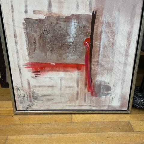 Abstrakt maleri på stort lærred med forskellige farver og motiver. Maleriet indeholder cirkulære og organiske former i nuancer af grøn, orange, rød og sort. Velegnet til vægophæng i stue eller kontor for at tilføre farve og kunstnerisk udtryk.