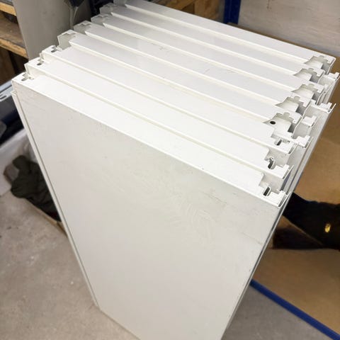 Tilbehør til reol, b: 90 d: 30, skråhylder til stålreol med konsoller - stabil, kraftig kvalitet (hylderne kan placeres vandret, der medfølger ikke konsoller til dette) mener det er fra ERFA-inventar - nypris 1262,,- / 5 sæt 750,- / per sæt (1 hylde + 2 konsoller - foto 2)