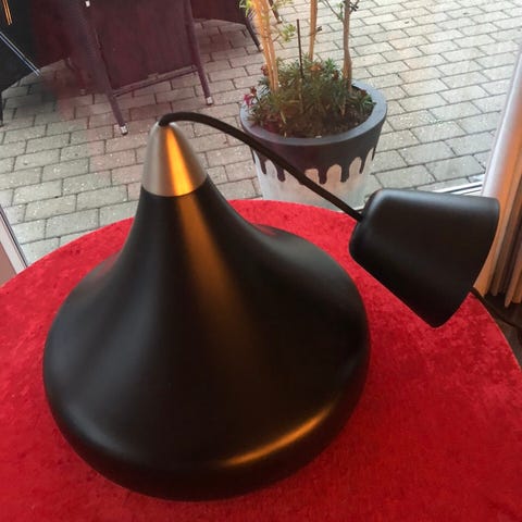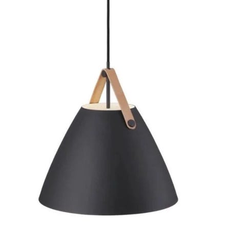 Sort metalskærm med lys inderside og smuk læderrem i cognac som ophæng.