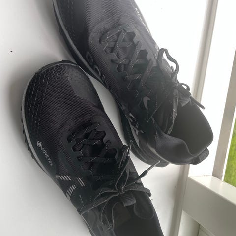 Nike Trail Løb Sko i størrelse 43. Skoene er designet til løb og har en sort og beige farvekombination. Materialet er åndbart og velegnet til sportsbrug. Skoene har en slidstærk sål med godt greb, hvilket gør dem egnet til trail-løb og udendørs aktiviteter.