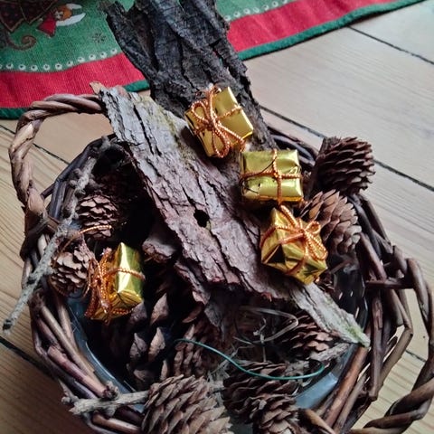 Fin lille kurv fyldt med dekorationsmateriale. Kurven indeholder kogler, lidt bark og små guld pakker. Suppler selv med det du mangler når du laver din egen juledekoration.
