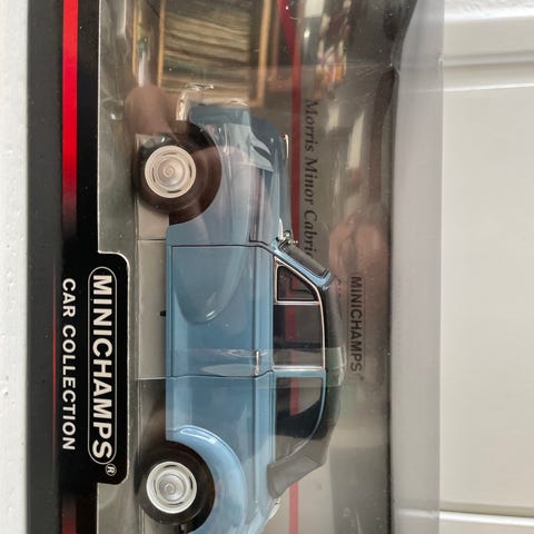 Minichamps Morris Minor modelbil i grøn farve. Samlerobjekt i skala, fremstillet med detaljeret design, der afspejler den originale bils udseende. Egnet til samlere og modelbilentusiaster.