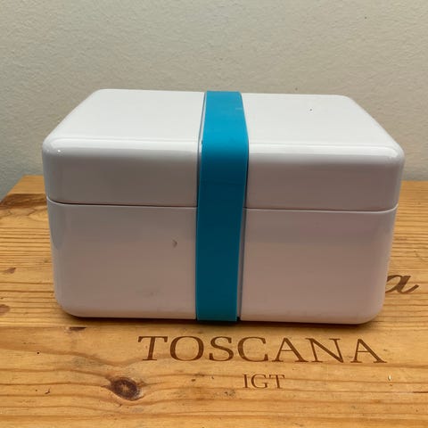 Hvid plast boks med blå elastik - 9 x 9 x 15 cm