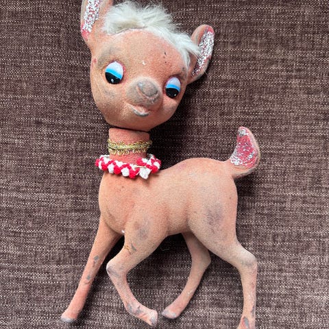 Retro Bambi bamse legetøj lavet af brunt plys materiale. Legetøjet forestiller en hjort med store øjne og detaljer som pletter på ryggen. Velegnet som dekorativt legetøj eller samlerobjekt. Fra røgfrit hjem, Kan sendes.