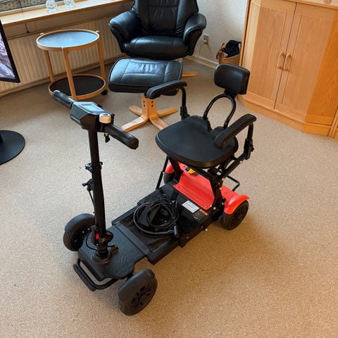 Den har altid stået inde og er kun brugt få gange. Medfølger: regnslag til scooter, kurv foran, og nyt batteri fra juni 2025.