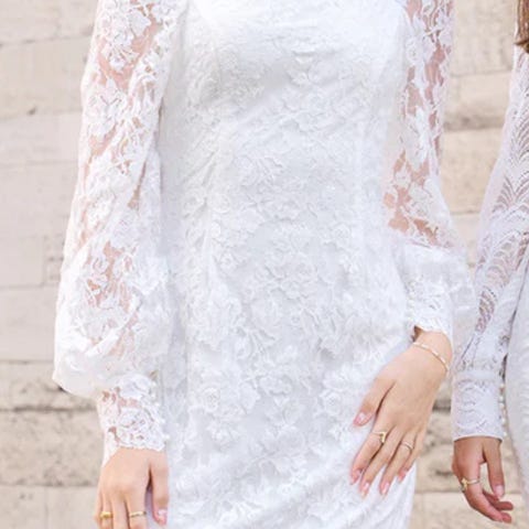 Den fineste, lidt enkle konfirmationskjole af mærket "Real Silk", købt sidste år i Panayotis. Knælang og med blondeærmer. På ærmerne er der påsyet pailetter hele vejen ned, og ærmekanten afsluttes med en lille perle. Der medfølger et perlebroderet bindebånd, dragtpose og evt. sløjfe til håret. Sløjfen er dog råhvid, mens kjolen er kridhvid.