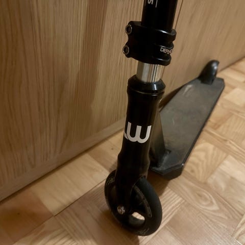 Har det her deck jeg ska af med fordi jeg stopper nok med at køre løbehjul. Har ogs andre dele man kan købe hvis man vil ha nogen flere. AO Scooters Air Pro løbehjul i blå farve, lavet af stål. Løbehjulet har en robust konstruktion og er designet til unisex brug. Produktet viser tegn på brug med synlige mærker og ridser, men er funktionelt.