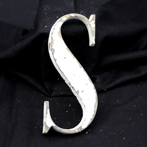 Overmalet facadebogstav i massiv messing med smuk rå patina, afskallet maling og naturlig oxidation. Et dekorativt lille bogstav med to originale gevindstænger på bagsiden.