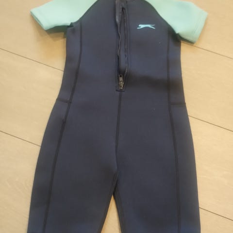 Slazenger Børne Våddragt i størrelse 4 år, designet til børn og unisex brug. Våddragten er blå med lyseblå ærmer og lavet af 100% polyester materiale. Den har kortærmede ben og en frontlynlås for nem påklædning. Egnet til vandsport og aktiviteter i vand.