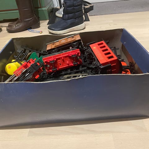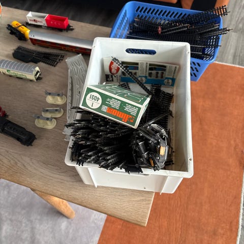 Sæt bestående af flere modeltogs vogne og lokomotiver i forskellige farver og designs. Indeholder passager vogne, godsvogne og elektrisk lokomotiv. Materiale og skala ikke specificeret. Velegnet til modeljernbane opsætninger og samlinger. Sender ikke.