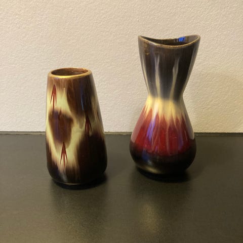 2 små vaser i fine farver, henholdsvis 8 og 6,5 cm høje. Sælges samlet.