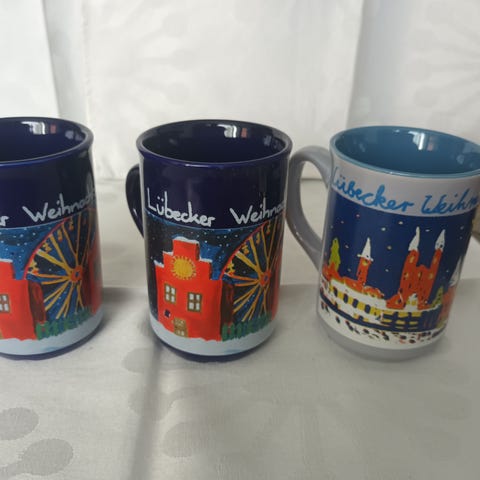 Porcelæn, krus, krus med naturplanter og Lübecker Weihnachtsmarkt krus fra 2005. 2009 og 2010. Alle 4 krus er i rigtig pæn stand. Kruset med dyrenes beskyttelse er SOLGT.