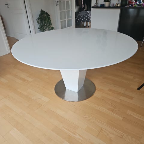 Rundt hvidt spisebord med stilfuld trompetfod i stål.