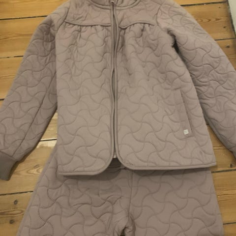 Wheat termotøj sæt i størrelse 92 til piger. Sættet består af en brun/lilla overdel og bukser med fint blomster og fugle mønster. Materialet er blødt og let isolerende.