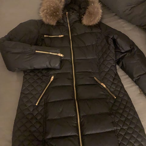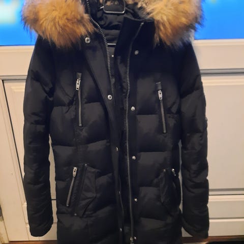 Sort Andet Udendørstøj i størrelse 42 til kvinder. Jakken har en sort farve og er udstyret med en hætte med ægte pelskant. Designet til udendørs brug med quiltet fyld for ekstra varme.