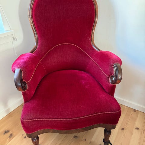 Yndig polstret lænestol betrukket med vævet, rosa tekstil og mørke, udskårne ben.