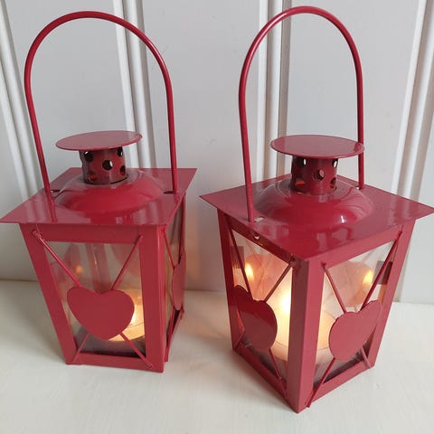 4 lanter til fyrfadslys. Rødt metal med hjerter. H. 9 cm.