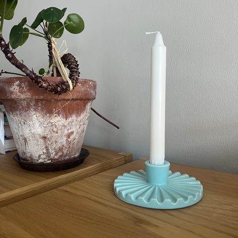 Så skøn rillet lysestage i lækker mintgrøn farve. Kun taget ud af æsken for at tage billeder. Ø ca. 13 cm.