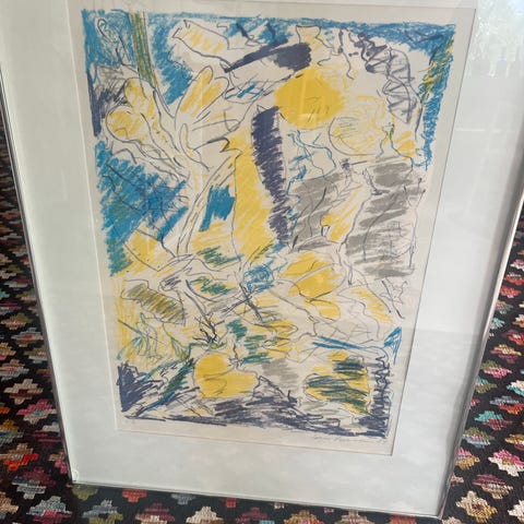 Jørgen Jakobsen billede med motiv af blå og røde blomster, omgivet af træer. Kunstværket er indrammet i en lys alurammer og har en abstrakt, impressionistisk stil. Farveskalaen domineres af blå, grønne og røde nuancer. Mål: bredde 78 cm, højde 81 cm.,