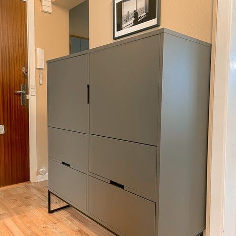 Sort skænk med to låger og to skuffer. Skænken har et moderne design med glatte, blanke overflader og metalben. Egnet til opbevaring i stue eller spisestue.