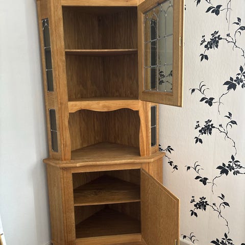 Fint hjøneskab til ophæng. Fyrretræ, nemt at male eller bejses efter ønske 😊