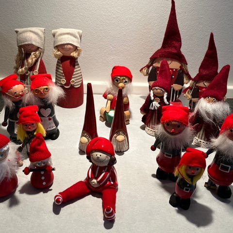 9 stk. julepynt / små træ figurer med forskellige udtryk fra bamse, nisser, nøddeknækker osv. i rød og sølv med snor i toppen.