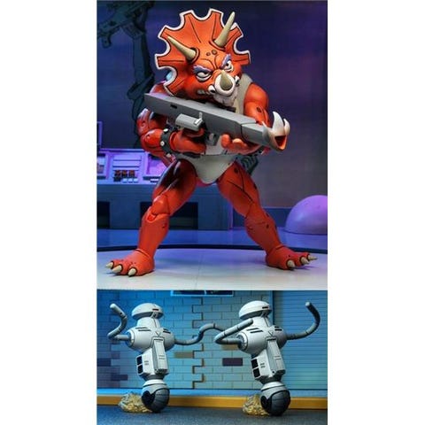 The TMNT Cartoon line has seen an infestation of rodents! Enter the Rat King. Equipped with soda grenades, a mutagen canister with a removable cap, and a flute to control his rat army, he marches through the sewers of New York to bring an end to human rule. Also included in the 2 pack is Channel 6's own cameraman, Vernon Fenwick. Standing approximately 7 tall, Vernon comes with a Channel 6 camera and interchangeable hands and head to turn him into a Were-rat!
