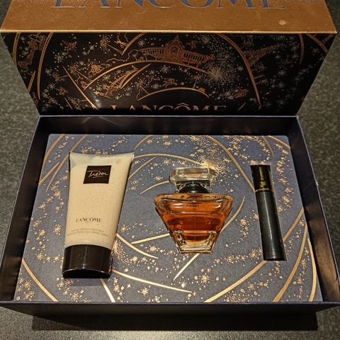 Eau de parfum, Gaveæske, Trésor, Gaveæsken indeholder Eau de Parfum 30 ml., Bodylotion 50 ml og Shower Gel 50 ml. Se billeder. Send mobilnummer for nærmere aftale.