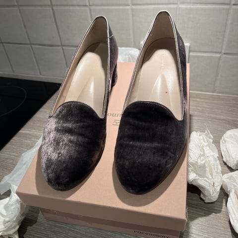 Barbro højhælet sko , mørkeblå ruskind. Skoene har en spænde-rem og en virkelig god pasform. Barbro sko er en type som Roccamore, men er desværre udgået. De er håndsyet i Italien. Jeg har givet 1100 kr., på udsalg, men har desværre ingen kvittering. De er købt for små, og er ikke brugt.