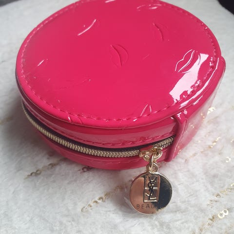 Kosmetik pung fra dior, købt i udlandet, var en del af et "Backstage set" men kun pung tilbage, aldrig brugt. Den er I blød plastic, lyserød, inderfor i meget blødt "velour" agtig stof. L: 20,5 cm, H: 12 cm og D 8 cm når den blir åbnet og udvidet.