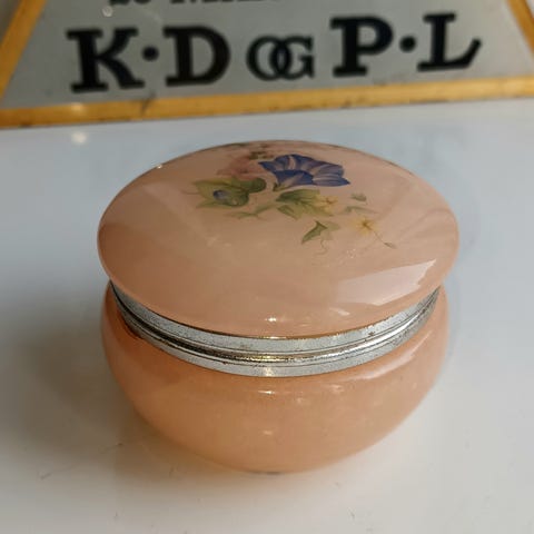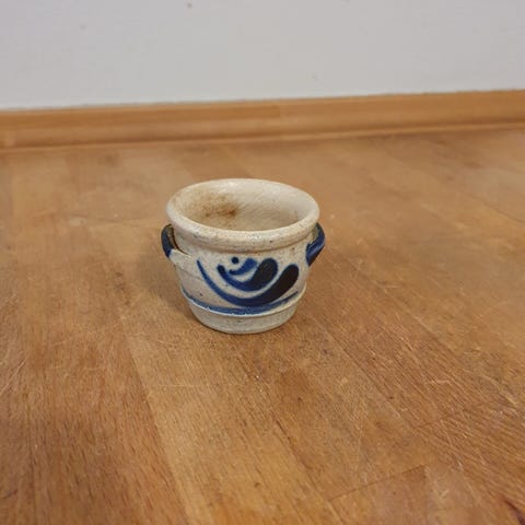 Krukken / smykkeskrinet måler 7 cm i højden og har en diameter på 8 cm.