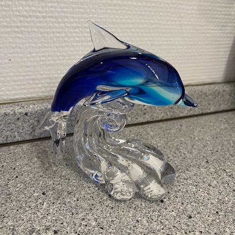 Glas delfin figur i blå og klar glas. Dekorativ genstand med detaljeret form af en delfin. Velegnet til pynt i hjemmet eller som samlerobjekt.