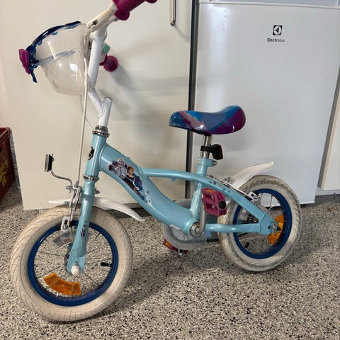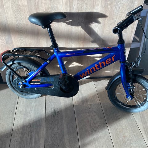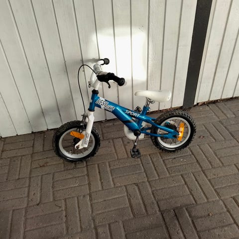 børnecykel med 12 tommer hjul, sort farve og stel i stål. Cyklen er designet til børn og har et enkelt gearsystem samt støtteben. Egnet til børn, der er ved at lære at cykle.
