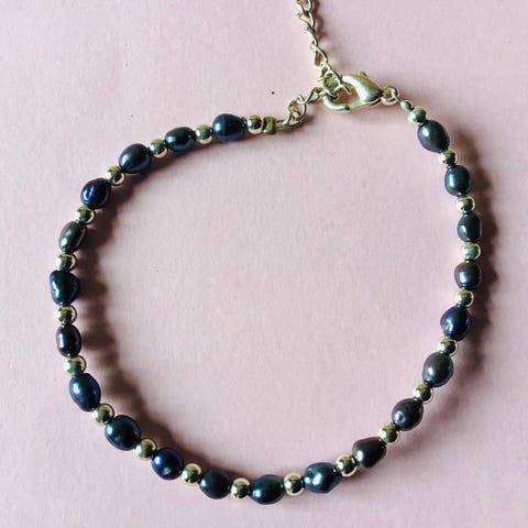Flot armbånd med store ÆGTE FERSKVANDSPERLER i en smuk mørk petrol farve. Perlerne er ca. 10 mm og armbåndet er 19 cm langt. Forsølvet lås og to store pynteperler af glas forrest. Armbåndet er helt nyt