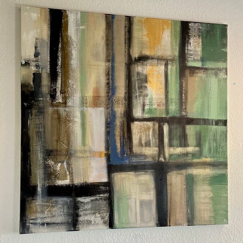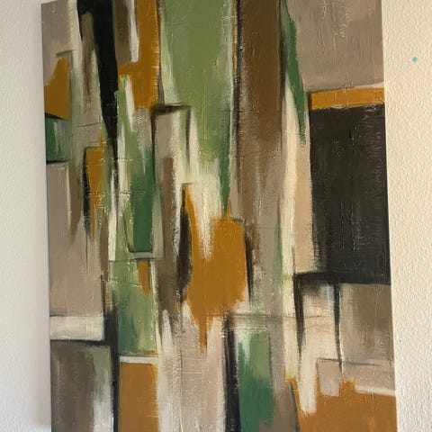 Håndlavet, Flot, stilet maleri, med sandfarvet baggrund, kaki brun, hvid, lysegrå og naive samt turkis grøn.