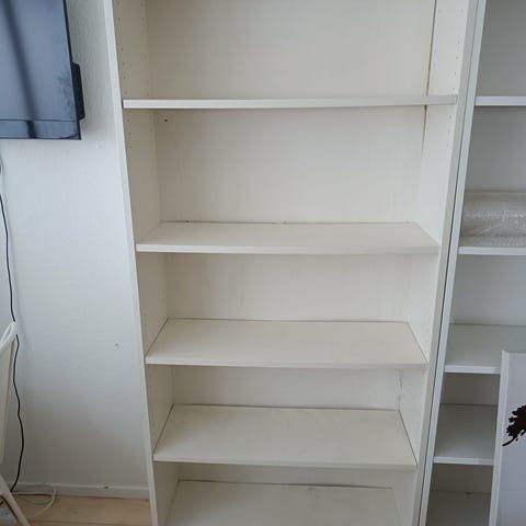 Reol fra 2008 med brugsspor - se eksempler på vedhæftede fotos. Solid og holdbar. 4 hylder medfølger.